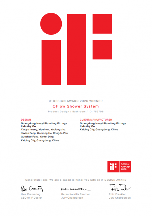 德国 iF 设计大奖创办于 1954 年,与红点设计大奖、美国 IDEA 工业设计杰出大奖并称世界三大设计奖,以 “独立、严谨、可靠” 的评奖理念成为全球设计领域的权威认可。此次华艺卫浴斩获大奖的 LuxeRain Shower System 与 Oflow Shower System,是品牌深耕人性化设计、坚持科技创新的匠心之作,更是国产洁具卫浴十大品牌在产品研发与设计美学上的顶尖呈现,完美契合了国货卫浴对品质、创新与可持续的核心追求。